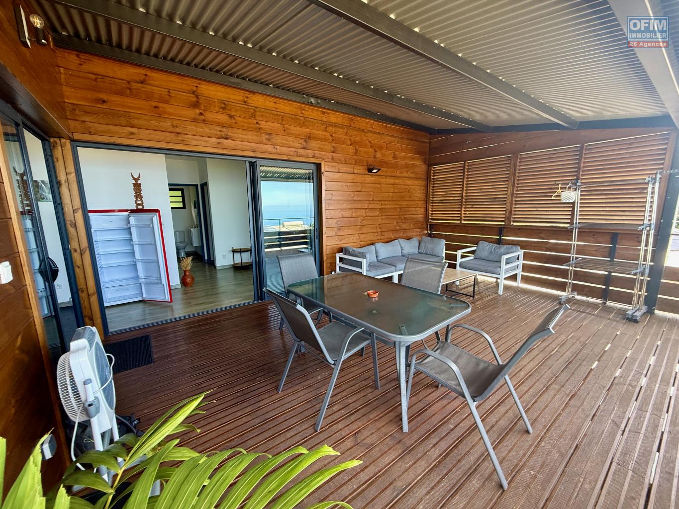 La seconde habitation est un bungalow en bois entièrement meublé comprenant une cuisine, un salon, deux chambres avec salle de bain, des toilettes séparées ainsi que deux terrasses, à l’avant avec vue mer et à l’arrière, et bénéficie d’une excellente rentabilité locative grâce à une location régulière sur Airbnb.