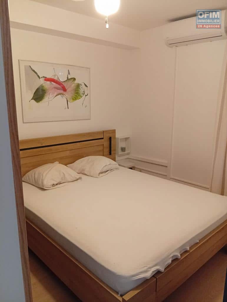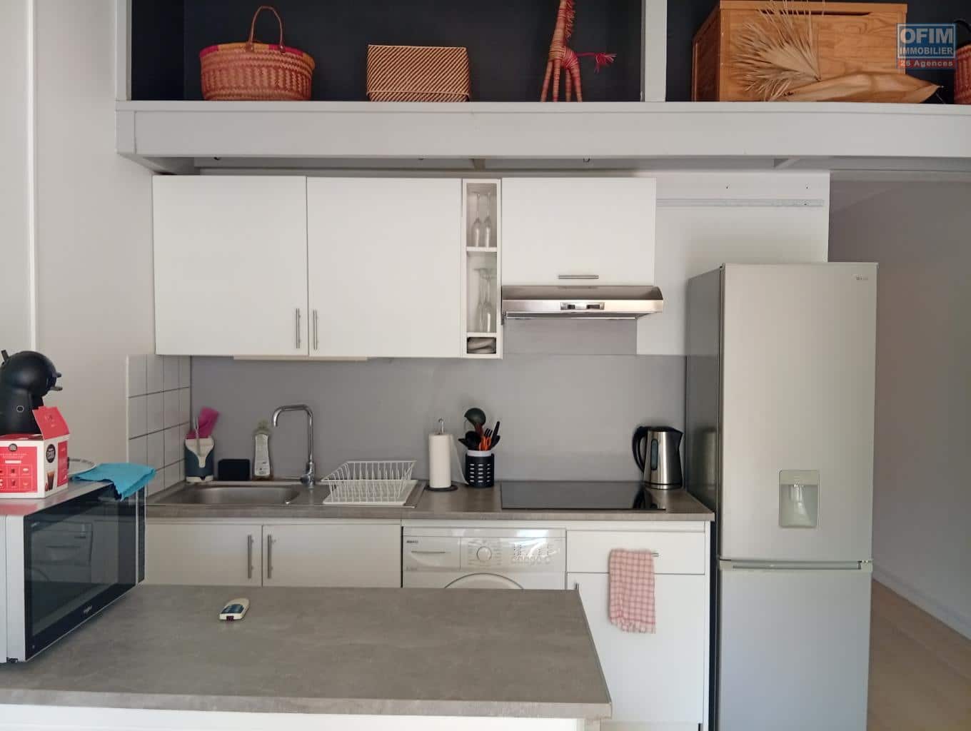 Cet appartement, au sein d’une résidence sécurisée, comprend une chambre climatisée avec placard intégré, une salle de bains avec douche à l’italienne et WC, un séjour climatisé avec cuisine américaine, ainsi qu’une varangue aménagée en salon avec ouverture.
